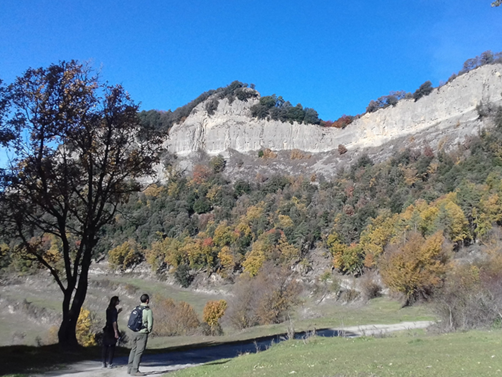 Per tornar al castell, reculem uns metres i prenem un corriol que surt a mà dreta en direcció al castell de Montesquiu. El camí travessa el torrent de les Dous i ens porta fins als plans i la masia de Planeses.