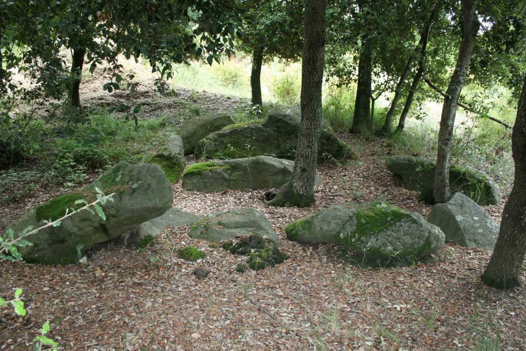 Poc més endavant, pujant pels vessants de la serralada hi ha la Pedra de l’Escorpí, que es tracta d’una agrupació de roques granítiques i paret de pedra seca que es feu servir com a lloc d’enterrament. Uns metres bosc endins trobarem la Pedra Foradada, un gran bloc granític foradat artificialment.